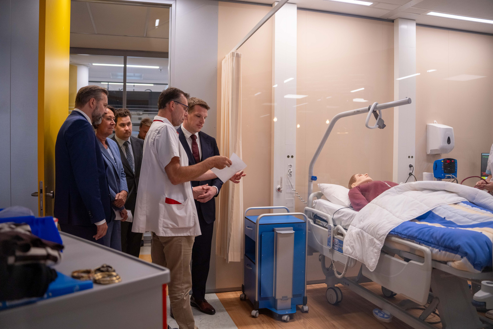 Minister van OCW Gouke Moes (BBB) krijgt uitleg in de ic van het PraktijkPlein, onderdeel van de scholen voor Zorg en Welzijn van ROC Mondriaan aan de Aspasialaan in Den Haag.