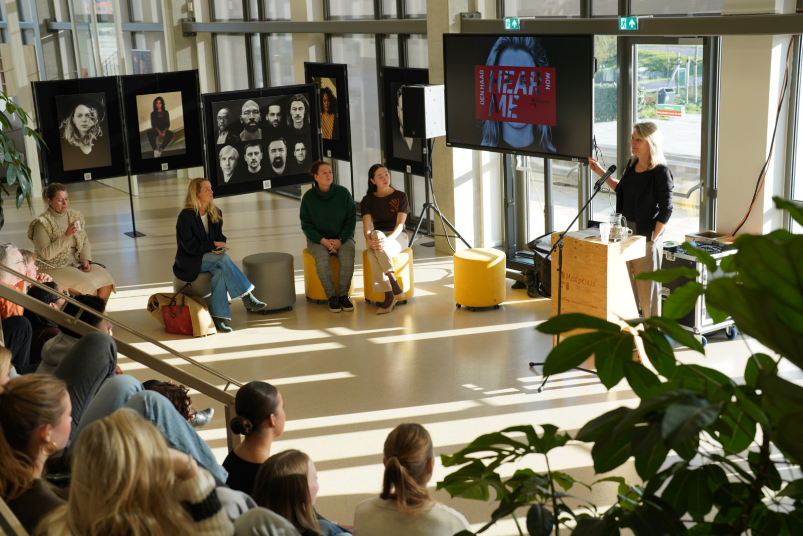 Leren praten over lastige thema’s “Een tentoonstelling als deze helpt studenten te laten nadenken over iets wat vaak lastig te bespreken is,” zegt Angelo Ros, docent Sociaal Werk. “We merken dat het thema hen raakt, en vinden het belangrijk dat onze school een veilige plek is om hierover te praten. Dat is waardevol voor nu, maar zeker ook voor hun stages en toekomstige werk.” De opening vond maandag plaats in aanwezigheid van studenten en medewerkers. Hear Me Now-organisator Sara Donkers en docenten spraken over het belang van sociale veiligheid binnen de opleiding. Daarna verzorgde spoken word-artiest Amara van der Elst een optreden dat de zaal stil kreeg en bezochten aanwezigen de expositie. In de komende weken bekijkt elke klas de tentoonstelling op een eigen moment en is er in de lessen aandacht voor het thema. Daarnaast organiseert Centrum 1622 #metoo-events, workshops en trainingen op school. Bewustwording De keuze voor de locatie aan de Vaz Diasdreef is bewust gemaakt. Hier worden studenten opgeleid die later in hun beroep te maken kunnen krijgen met kwetsbare doelgroepen. ROC Mondriaan vindt het belangrijk dat studenten signalen leren herkennen en zich bewust zijn van hun eigen rol in het creëren van een veilige omgeving, zowel op school als in hun beroep. Ilias, student Sociaal Werk, was bij de opening aanwezig en vertelt: “Het is een onderwerp waar je wel eens wat over hoort, maar waar je te weinig echt stil bij staat. Door hier op school aandacht aan te geven denk je er toch over na hoe je zelf zou handelen in zo'n situatie of hoe je anderen dan steun kan bieden.” Over de expositie In Hear Me Now zijn twaalf vrouwen en twee mannen te zien die open vertellen over ervaringen met geweld en de weg naar herstel. Een deel van de tentoonstelling was vorig jaar al te zien bij ROC Mondriaan aan het Leeghwaterplein. Dit jaar zijn de verhalen van de twee mannen toegevoegd. Daarnaast is er een paneel met acht mannen te zien, die vertellen hoe zij naar het thema kijken en hoe zij zichzelf zien als onderdeel van de oplossing. De tentoonstelling maakt deel uit van Orange the World, de internationale campagne tegen geweld tegen vrouwen en meisjes. Relevantie en timing De tentoonstelling is te zien tot en met 28 november en omvat daarmee ook 25 november, de Internationale Dag tegen Geweld tegen Vrouwen. Dat benadrukt het maatschappelijk belang van het onderwerp. ROC Mondriaan werkt al vijf jaar samen met Centrum 1622 aan programma’s rondom sociale veiligheid en #MeToo-gerelateerde thema’s. Deze nieuwe editie van Hear Me Now sluit aan bij die traditie en draagt bij aan een veilig en open leerklimaat. |
